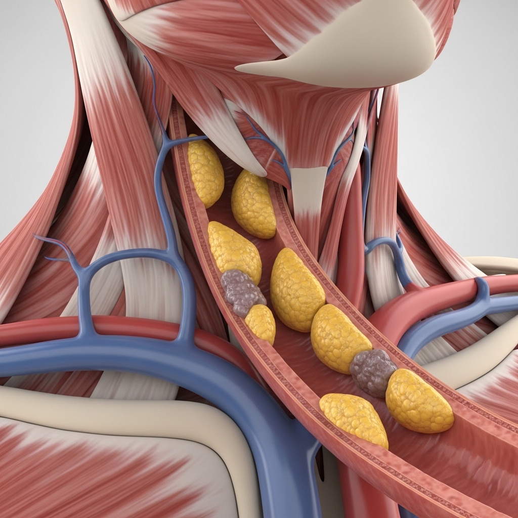 Carotid atherosclerotic disease occurs when the carotid arteries in the neck become narrowed or blocked due to fatty deposits called plaque. These arteries are essential for supplying blood and oxygen to the brain, and narrowing can reduce blood flow, increasing the risk of stroke. Plaque buildup is often caused by risk factors such as smoking, poor diet, lack of exercise, high blood pressure, diabetes, and aging. Sometimes, pieces of plaque can break off and block smaller arteries in the brain, leading to a stroke, which may cause weakness, speech difficulties, vision loss, or paralysis. Early warning signs, including brief episodes of weakness or vision changes known as transient ischemic attacks, should never be ignored. Treatment focuses on lifestyle modifications such as quitting smoking, eating a healthy diet, exercising, and managing blood pressure, cholesterol, and blood sugar. In more severe cases, interventions like carotid endarterectomy or carotid stenting may be performed to restore proper blood flow and prevent strokes.